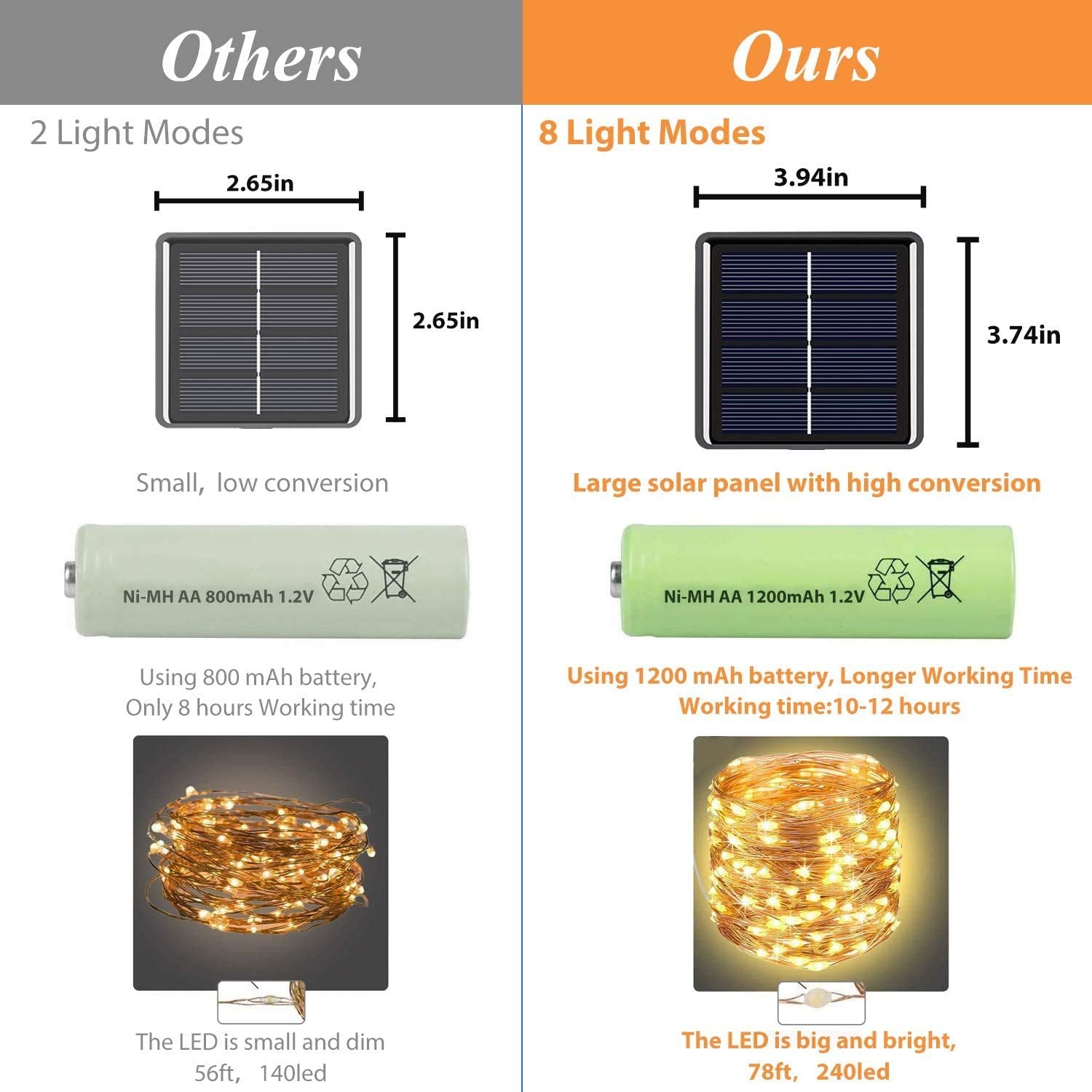 Built-in Rechargeable Battery: Stores solar energy in the day to keep the lights glowing up to 8-10 hours at night when fully charged.
