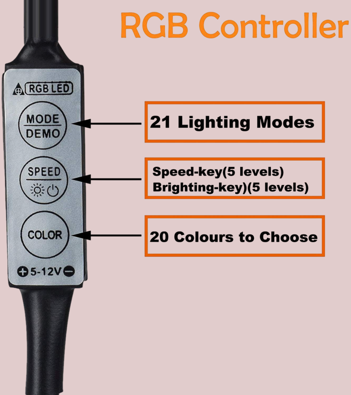 Multiple Colors & Multi Mode Selection 20 different colors -Red, Green, Blue, Yellow, Pink, Purple, White. (Just tap the 3 Key button present at the 5V USB)