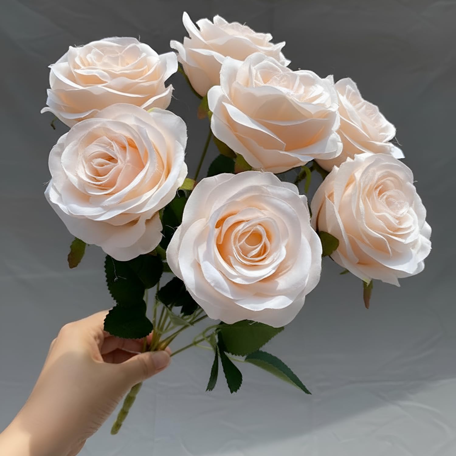 7 Beautiful Rose Heads – Full bouquet with soft light pink petals and lush green leaves for a natural appearance.