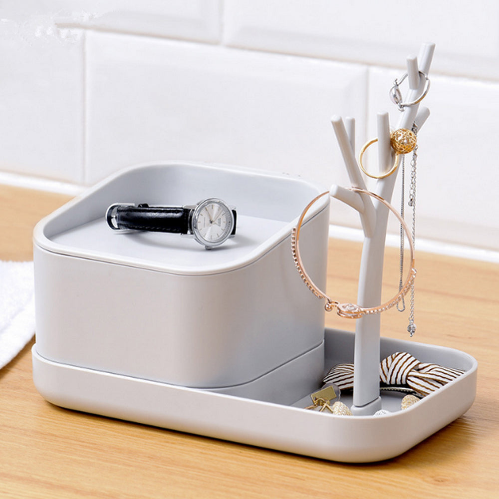 BOX CONTENT : 1 Large Box, 1 tree shaped hanger with tray, where you can easily organize your makeup accessories - lipstick, Nail polish, Mascara so on. Also providing a tree shaped hanger where you can easily hang your small jewelry pieces - rings, necklace, chain, Bracelet, keys etc.
