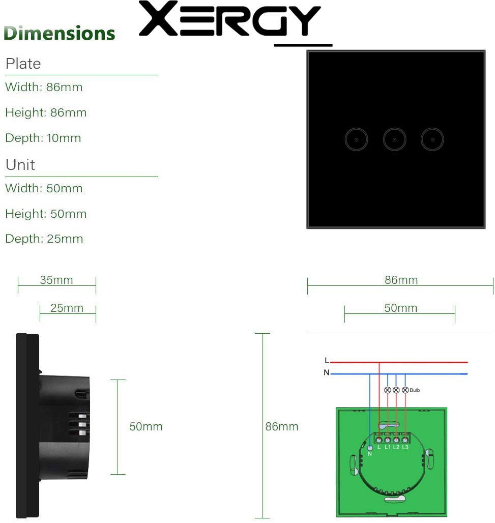 1-Xergy 3 Gang Smart WiFi Light Switch with Touch Panel