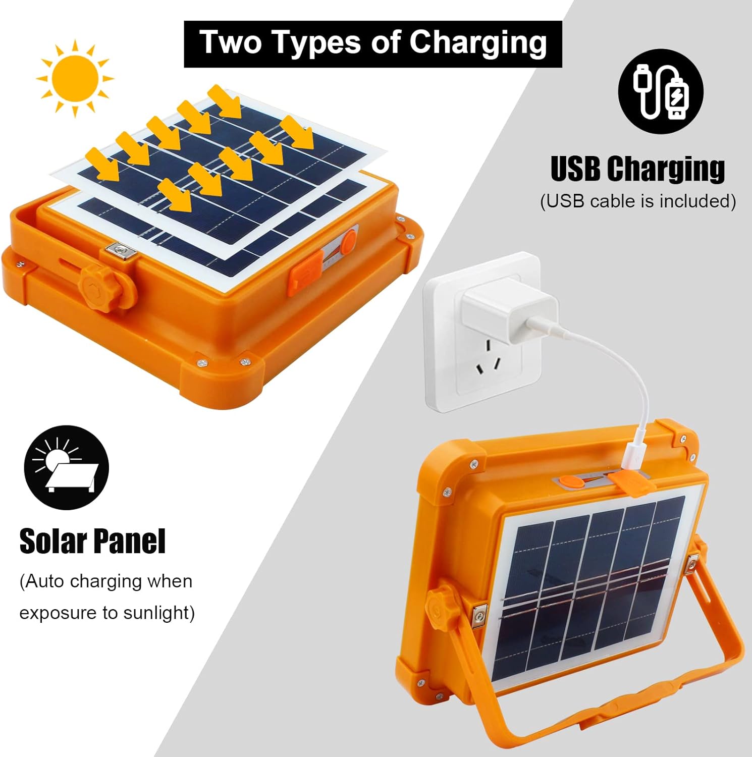 Dual Charging Options- Conveniently rechargeable via solar power or USB cable, ensuring you never run out of power—day or night.