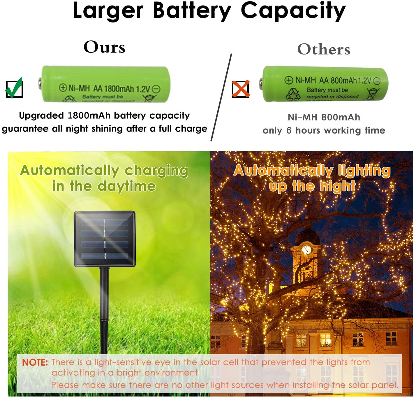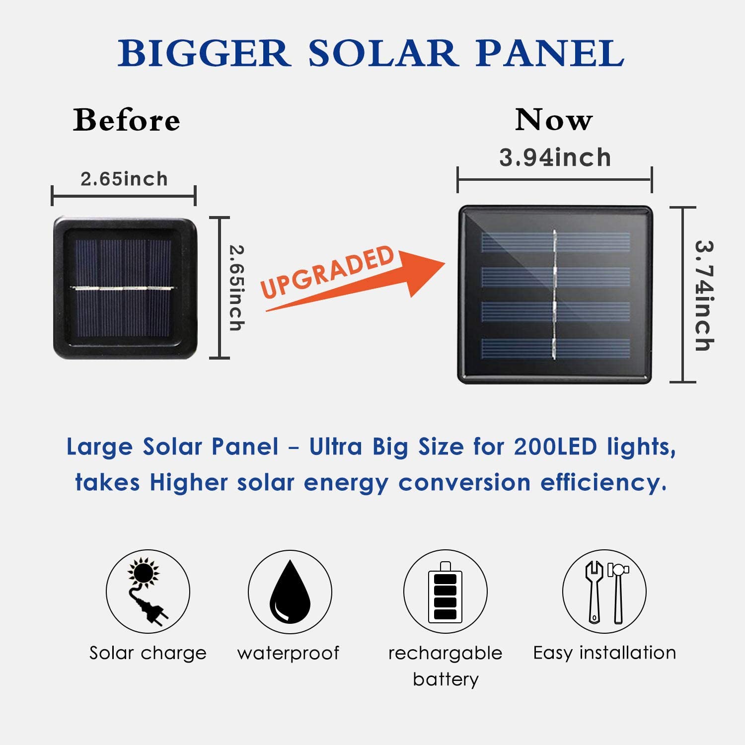 Water Resistant - Both the string lights and the solar panel are IP65 Waterproof. No worry to use them in the rain or any harsh weather.