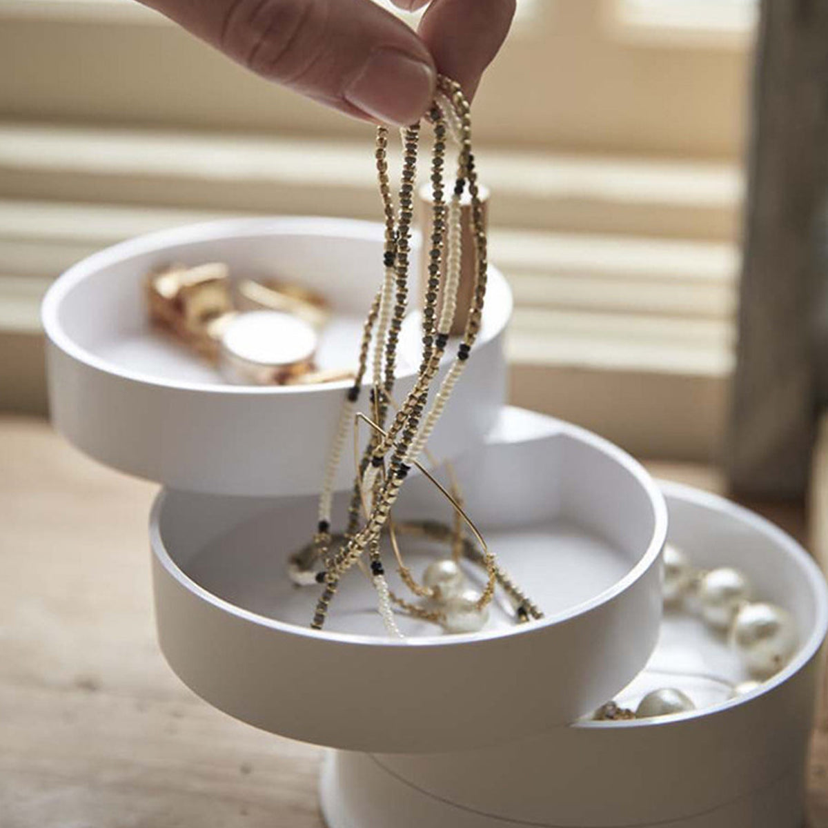 360* Rotatable : 4 Layer Classified Jewelry Box, 4 Tier help sorting your different jewelry, great for rings, earrings, necklaces, bracelets, watches and other small items such as keys, coins. White design, you can easily find what you need at a glance.