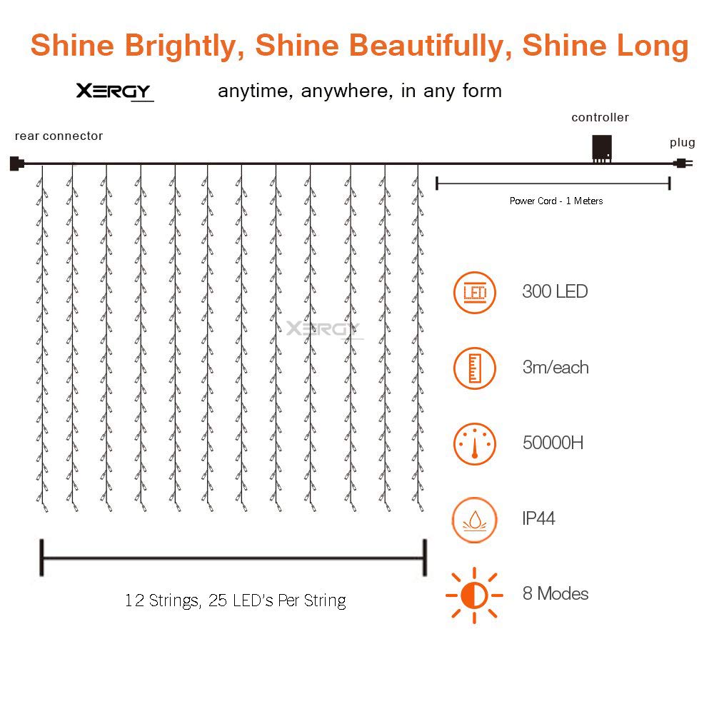 XERGY 3m x 3m 304 LED Curtain Lights – Ideal for decorating walls, windows, doors, ceilings, lawns, and more.