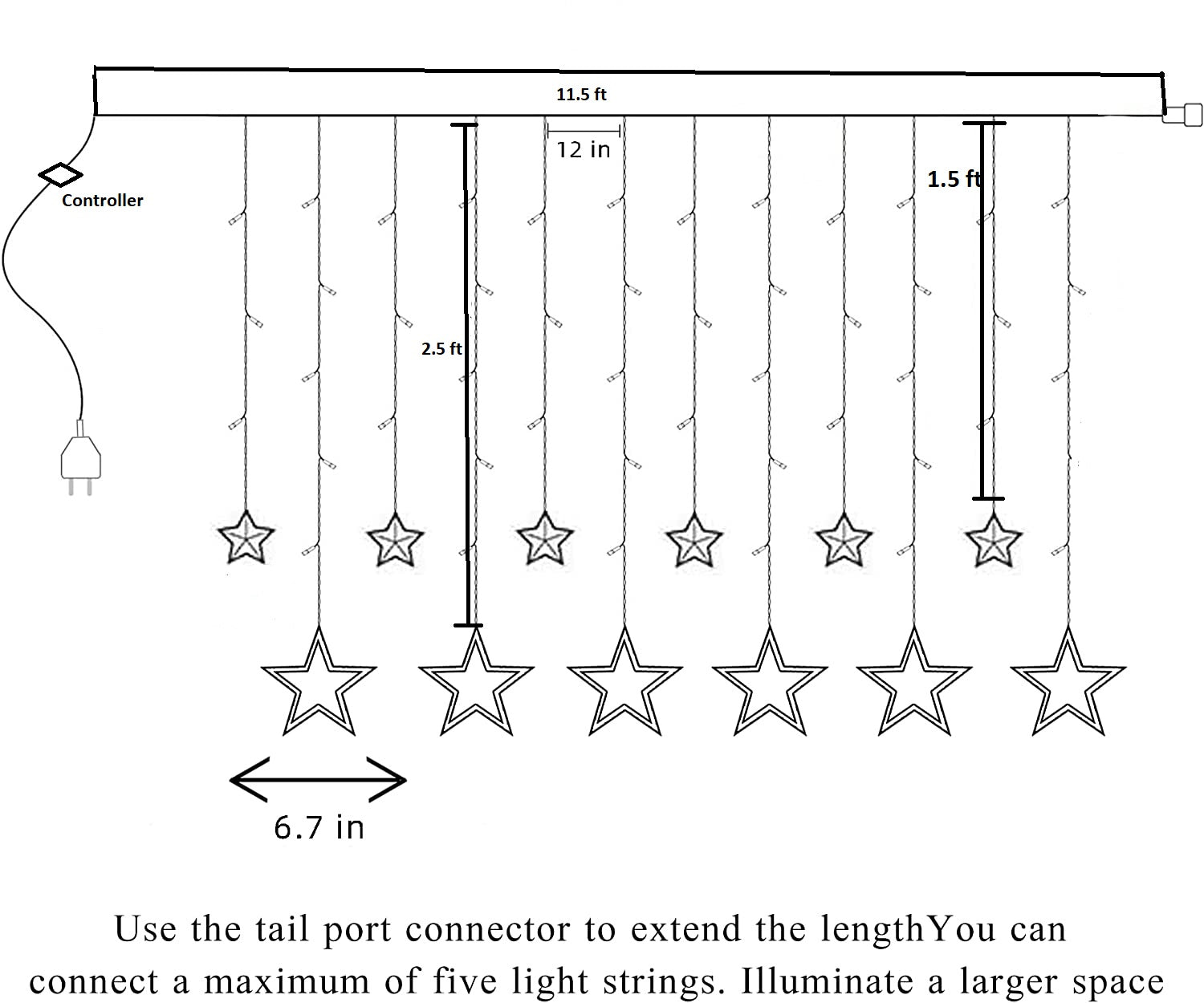 UNIQUE STRUCTURE- Total LED number of Qantas star Christmas curtain lights is 138, including a total of 12 stars ornaments (6 big 6 small). The wire length of 2m, the large star ornaments diameter 20cm, which each string droops 1m; Small star diameter 15cm, which each string droops 60cm. Super long power line length 3m